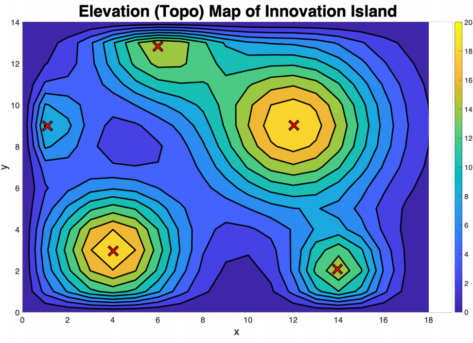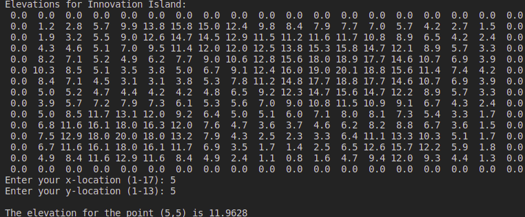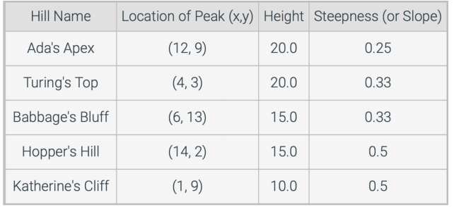 A topographic map is generated and the user is asked to input locational coordinates to determine if the user is on top of a hill.