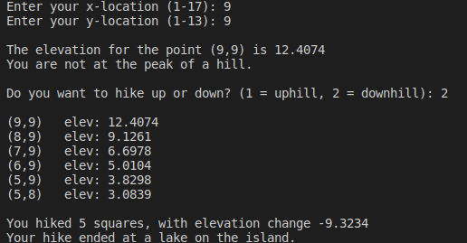The user inputs a locational coordinate and is asked to to go uphill or downhill. The program will find the best path that addresses the user's input.